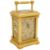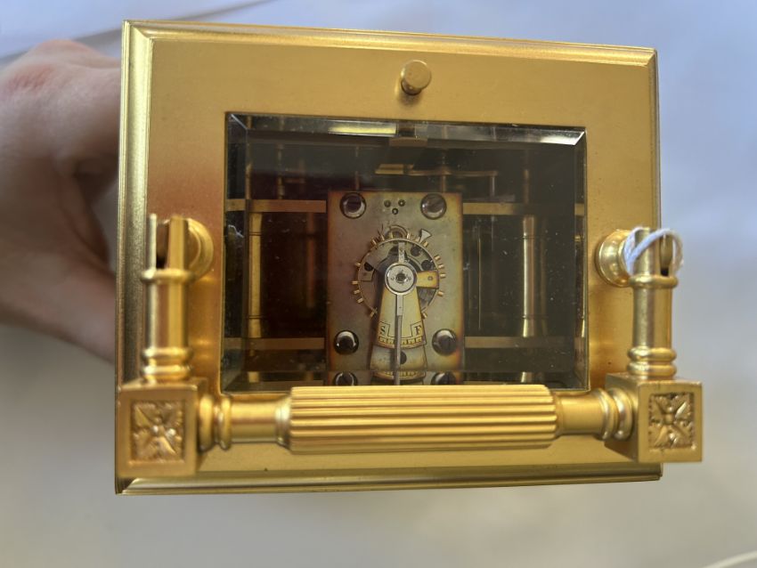 A late 19th century French ormolu repeater carriage clockcream enamel dial with red Arabic numerals, blued steel hands and foliate pierced part silvered foliate mask, 8 day movement, platform lever escapement with push button hour repeat striking on a coiled gong, the backplate stamped 'Patent Surety Poller', 'G.L' and numbered 852, the case with carrying handled, glazed inspection top, the corners with fluted pilasters, the sides inset with fret pierced foliate part silvered panels against cream enamel, raised on a stepped plinth base