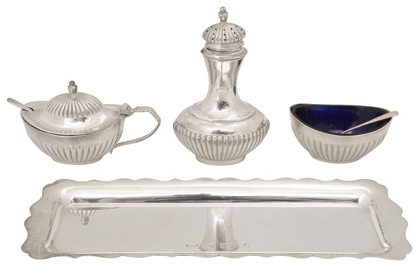 A modern silver three piece cruet set and trayBirmingham, 1978 by R. E. Porterof half fluted tapering oval form with spoons and blue glass liners accompanied by a rectangular tray with wavy edged raised border, (3)tray