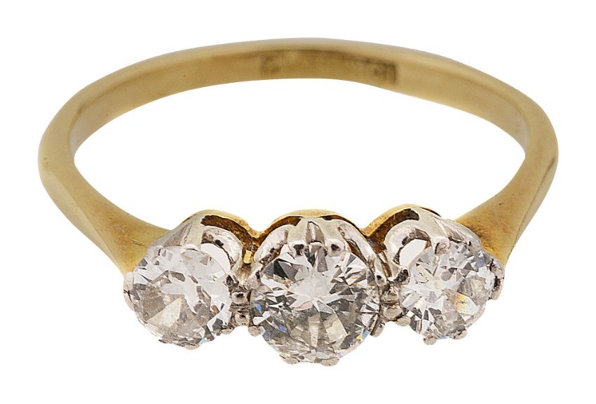 A diamond three stone ring set with very slightly graduated modified brilliant-cut diamonds to the coronet setting and plain tapering band stamped d 'PLAT&18CT' ring size K, 2.0gm