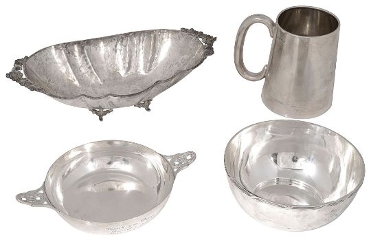 A George V presentation sugar bowl, a quaich a christening mug and an Italian .800 twin handled dishfirst Sheffield, 1929 by Walker & Hall, of plain circular tapering from with ribbon and reed border, crested and with engraved inscription dated 1931, second Birmingham, 1928 by Deakin & Francis, of plain circular shallow form with twin pierced handles, with presentation inscription, third, Sheffield, 1925 by Cooper Brothers, of plain tapering form with loop handle, initialled and dated, 1931, fourth, stamped 800 of shaped oval planished form with foliate cast twin handles and feet, (4)first diameter 12 cm., weight approx. 20.09ozt.