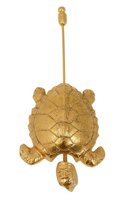 A Chanel pin in the shape of a turtle with colourless paste eyes, the addorsed CCs on the head with a sprung neck, signed 'Chanel 96 A made in france' Turtle body approx.