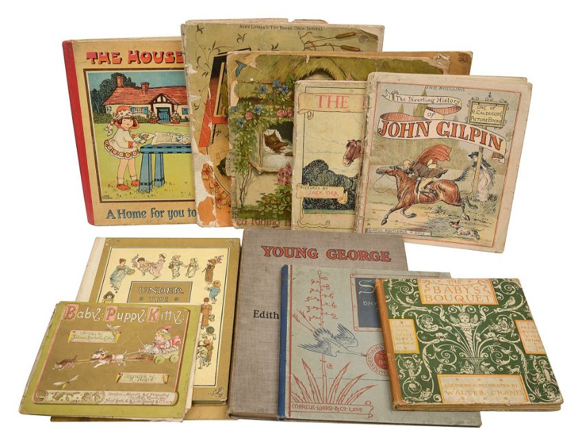 Children's Illustrated picture booksto include Slate and Pencil Vania decyphered by Walter Crane, 1885, The Baby's Banquet arranged and decorated by Walter Crane, Randolph Caldecott's Picture Books: The Farmers Boy, the Diverting History of John Gilpin, The Great Panjandrum Himself, A Frog He Would A-Wooing Go, An Elegy on the Glory of Her Sex Mrs Mary Blaize and Ride A-Cock Horse to Banbury, together with The Farmer's Boy, Illustrated by Jack Orr, Farmiloe, Edith., Young George His Life, London, 1902, Red Riding Hood Cottage, London Ernest Nister, Baby's ABC and A was an Archer both mounted on Linen, Frederick Warne, Ewing, Julian Horatia, Baby:Puppy: Kitty etc., (qty)