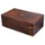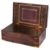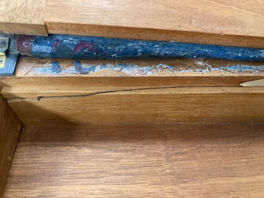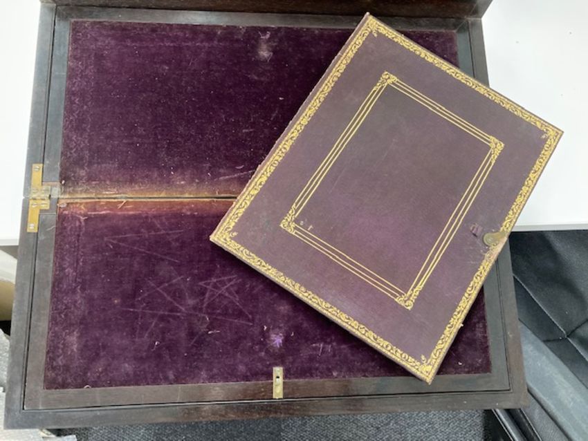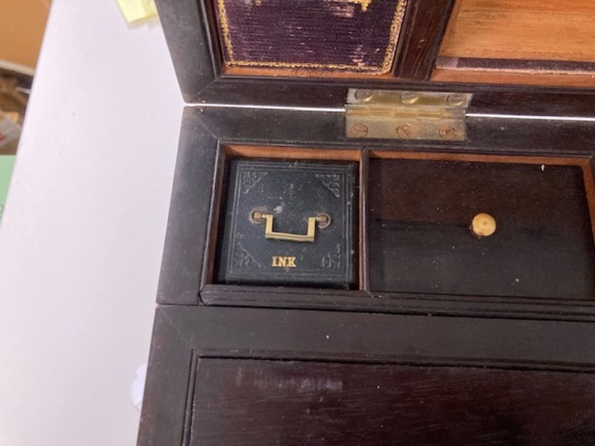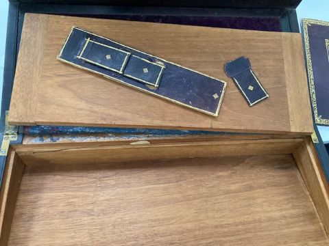 Condition: Overall fair condition. Leather section to lid is detached and needs reglueing. One small tongue torn off. others with some minor tears. Hinge of central section of lid has worn through One compartment lid replaced with a tack. Velvet worn through on hinge. Small section of brass biding absent. Hairline crack to one side of lid