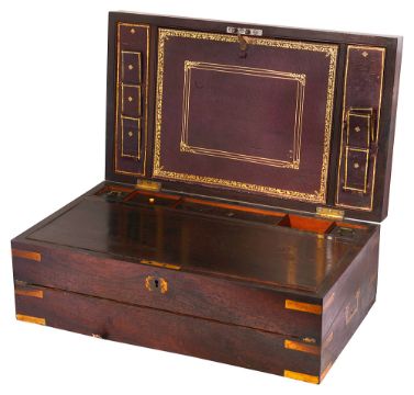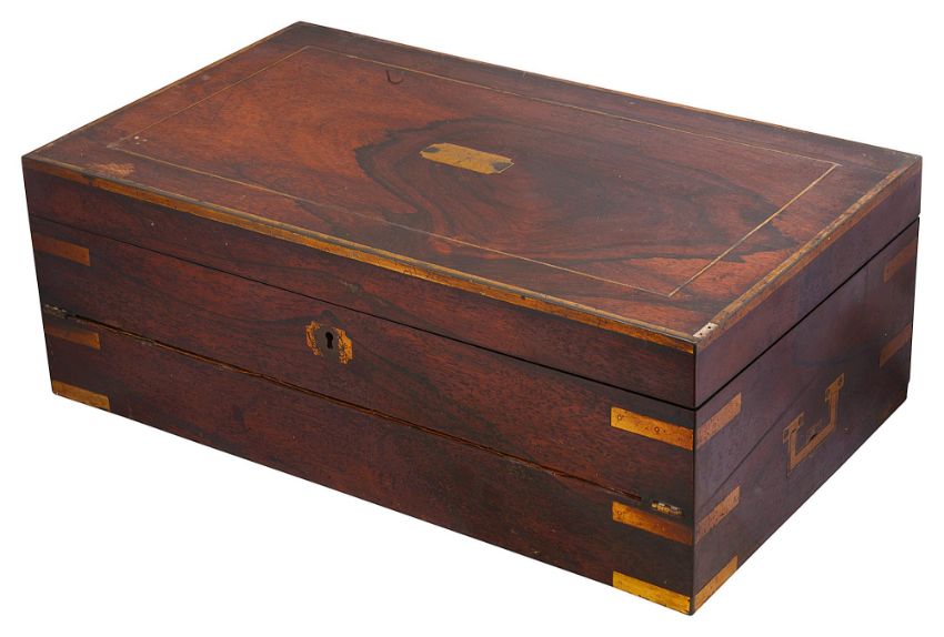 An early 19th century brass bound rosewood campaign writing slope c.1830the interior with gilt tooled grained red morocco lined lid, lidded compartments, inkwells, tooled red velvet writing surface and a secret compartment with two drawers