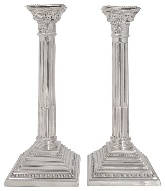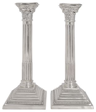 A large pair of Elizabeth II silver Corinthian column candlesticksBirmingham, 1958 by Bert Gordon stop fluted with beaded borders and detachable drip pans, on stepped square weighted bases, (2)