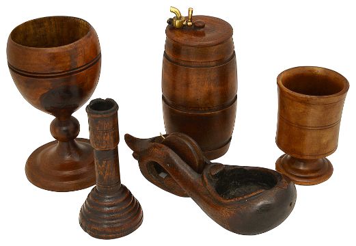 A treen turned oak candlestick, a beechwood string barrel and other itemsfirst in 17th century style on a domed base, together with a sycamore goblet, an olivewood goblet and a Japanese elm sumitsubo, (5)first