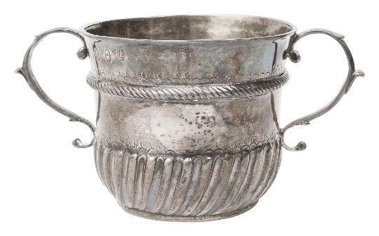 A Queen Anne Britannia silver twin handled porringerLondon, 1702 by Timothy Leyround bellied body with lower spiral fluting, ropework girdle and punched decoration