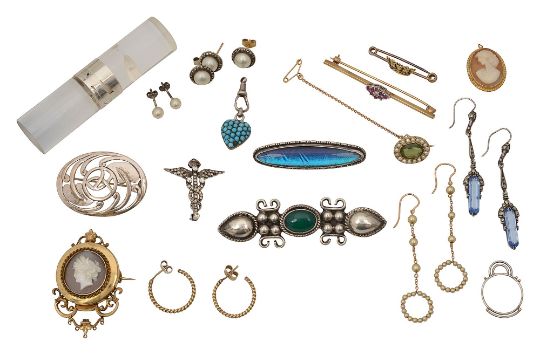 A small group of assorted jewelleryto include: a 9ct yellow gold bar brooch centrally-set with a diamond and ruby cluster; an oval tourmaline and half pearl brooch mounted in yellow gold stamped '9ct'; a 15ct yellow gold naval brooch stamped '15'; three silver hallmarked abstract rings (one a/f) by Wendy Ramshaw on a perspex stand, (qty)The former approx