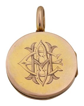 A circular yellow gold hinged locket pendant the obverse engraved with a monogram in Gothic script, the reverse set with a cabochon turquoisediameter 3.1cms,