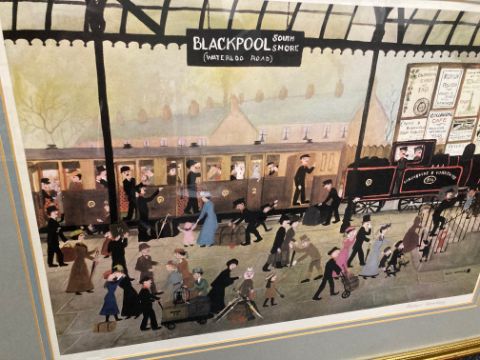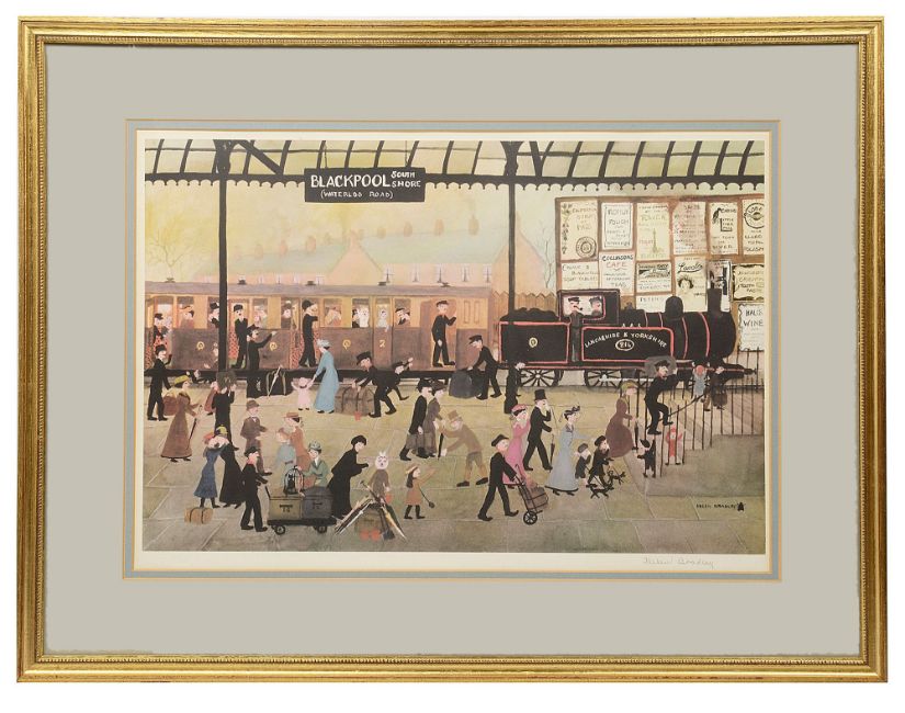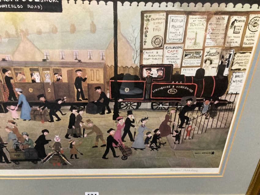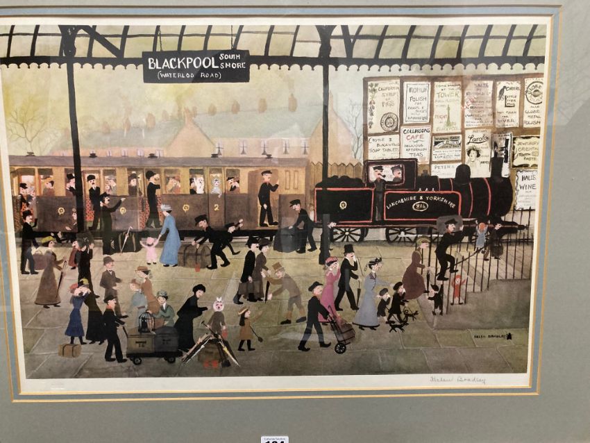 Helen Bradley (British, 1900-1979) Blackpool Stationprint, signed in pencil lower right, blind stamped lower left for the Fine Art Trade Guild, letter code BDF, mounted and framedoverall 60cm x 77cm, within mount 37cm x 56cm
