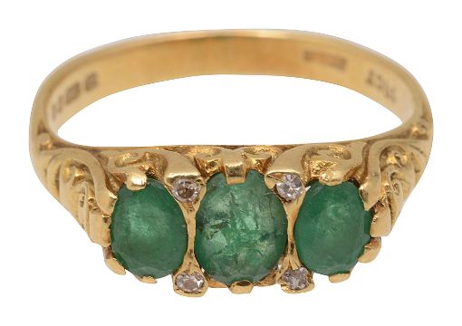 An emerald and 18ct yellow gold ringset with three oval mixed cut emeralds with a single-cut diamond points between, scrolling gallery and shoulders, London 1975ring size O, 4.5g