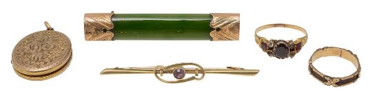 A garnet ring, with a brooch, locket, 15ct tie pin and a ringthe ring with three garnets, the nephrite brooch with chased gilt ends, the tie pin with a central amethyst, marked 15ct 625, the oval locket with chased floral decoration, and a gold and plaited hair memorial ring (5)approx. weight 9.7g