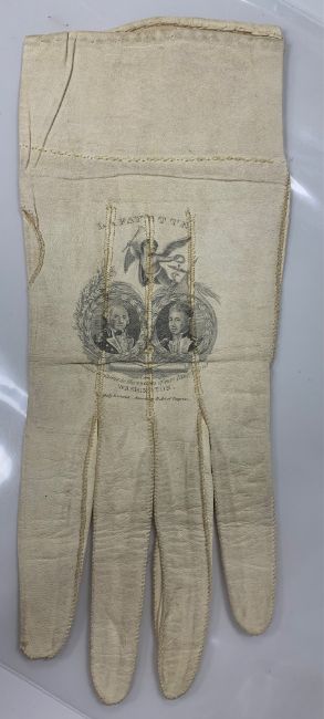 The Marquis of Lafayette (Gilbert du Motler, Marquis de La Fayette) : A rare early 19th century commemorative white kid leather glove, probably produced to celebrate Lafayette's visit and tour of the United States of America, c. 1824/5, decorated with printed portrait medallions of George Washington and Lafayette alongside one another, captioned 'Lafayette - Grateful Welcome to the Friend of our Illustrious Washington, Duty entered According to Act of Congress', with paper bearing letter of provenance,