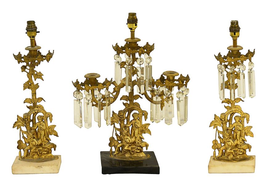 A mid 19th century American gilt metal garniture of lustre candlesticks, adapted as lampsProbably Cornelius & Co, Philadelphia all with branch and leaf form arms, bases comprising arches with two young boys with dogs and fishing rods, the three arm example with a black marble base, the two single examples both with white marble bases, drops lacking to one single example, (3)