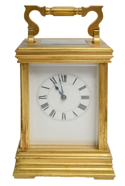 A large late 19th century French ormolu cased carriage clock white enamel dial with black Roman numerals, minute track and blued steel hands, silvered platform escapement with compensated balance, 8 day movement with passing strike on a coiled gong, four glass moulded case with carrying handle and inspection top, on a plinth base, with a leather travel case