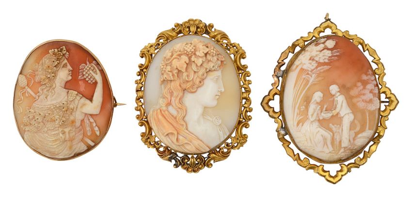 Three oval carved shell cameo broochesthe first depicting a Bacchante holding a bunch of grapes and a thyrsus and wearing a faunskin pelt, the second of a lady with a wreath of grapes and vine leaves in her hair, including frame (cracked and converted from a clasp); the third of a courting couple with a dog in a landscape, including frame (a/f), (3) the first 5.7cm x 4.8cm