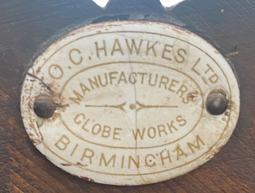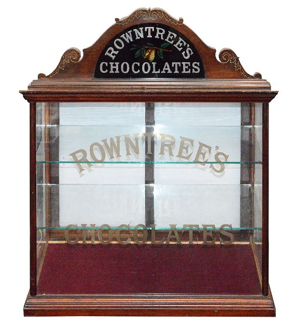 A Rowntree's Chocolate glazed display cabinetlate 19th/early 20th century glazed advertising shop display cabinet, carved pediment with inset glass picture of a cacao pod surrounded by 'Rowntrees Chocolates' including two plate glass shelves, sliding glass doors to the reverse, makers seal to the reverse 'O.C. Hawkes Ltd Manufactures globe works Birmingham'Approx. width 82cm, approx. Height 96cm. approx depth 43.5cm Condition: In fair overall condition with signs of wear commensurate with use and age. The glass shelves have been replaced. Viewing recommended in person.This lot must  be collected from the Auction venue by 1pm Friday 10th February.  Please arrange transport before this deadline.   Uncollected property will be transported to our offsite storage facility and collection can be arranged by appointment only.  Additional fees of £20 apply for the transport