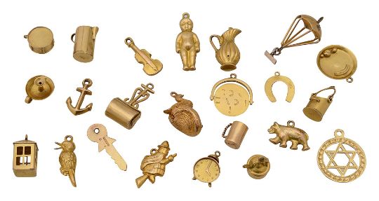 Twenty-three assorted charms mostly either hallmarked for or stamped '9ct' combined gross weight 19.2g