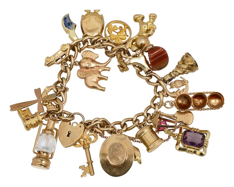 A 9ct yellow gold curb link bracelet with padlock clasp and suspending assorted charms and a fob seal and a banded agate swivel, some hallmarked 9ct yellow gold with a charm looseapprox. weight 60g