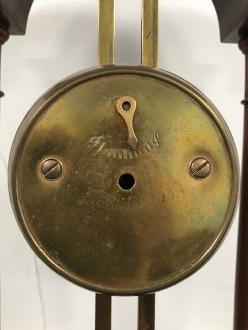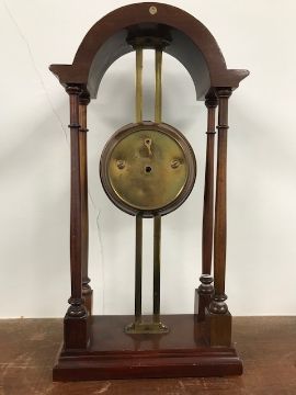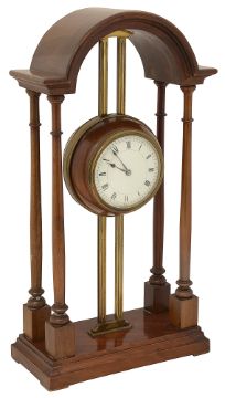 A late Victorian mahogany descending rack gravity mantle timepiece c.19003.5" diameter white enamel dial with black Roman numerals and outer minute track and Arabic quarters, single train movement, portico style case with arched pediment supported on slender column uprights, rectangular moulded platform base