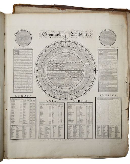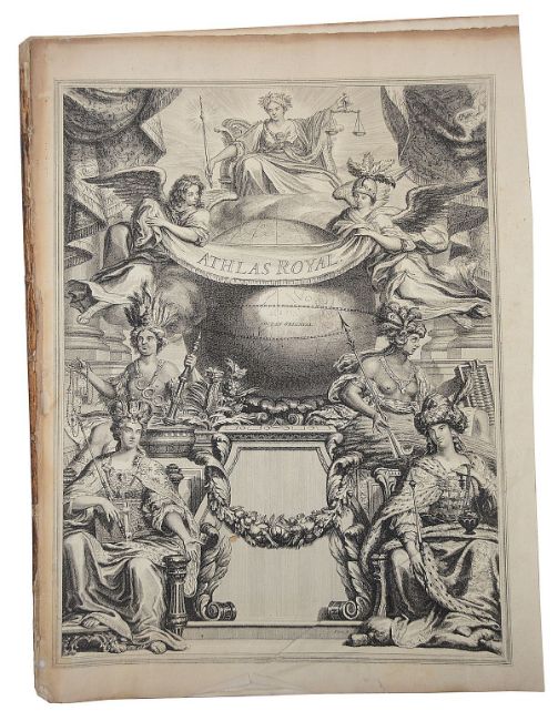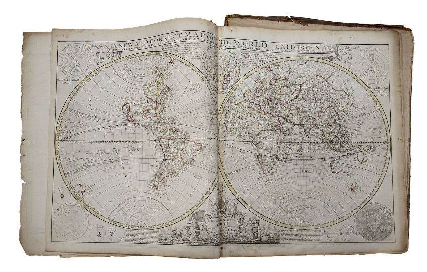 Atlases. Moll., Hermann. (d.1732) et al., Athlas Royal (The World described: Or a New and Correct sett of Maps)London, c.1733pen annotated endpaper listing 28 copper engraved maps as bound with contemporary outline colouring, b&w frontis engraved by J. Cole., elephant folio, containing as numbered in pen: all Moll, Hermann and published by J & T Bowles unless stated 1. A New & Correct Map of the Whole World, 1719, folding, 2. A New and Correct Map of the World, laid down according to the Newest Discoveries.3. Map of Europe, 17084. Map of Asia5. A Map of the East-Indies6. Parker. S. , Geographia Sacra or a New & Compendious Maps of the Holy Land ..., sold by Overton & Hoole7. Map of Africa8. Map of The Turkish Empire in Europe, Asia and Africa, ... also Morocco9. Map of North America10. A New an Exact Map of the Dominions of the King of Great Britain on ye continent of North America, 171511. A New Map of the North Parts of America claimed by France, 1720 12. Map of South America13. Morden., Robert A New Map of the West-Indies, or the Islands of America, printed by William Knight14. A New & Exact Map of the Coast, Countries and Islands within ye limits of the ye South Sea Company14. The South Part of Great Britain, called England and Wales, 171015. The North Part of Great Britain, called Scotland, 171416. A New Map of Great Britain17. A New Map of Ireland, 171418. A New and Exact Map of Spain & Portugal, 171119. A New and Exact Map of France20. A New and exact Map of the United Provinces, or Netherlands &c.21. A Most Exact Map of Flanders or Austrian Netherlands &c.22. A New Map of Germany. Hungary. Transilvania & The Suisse, 1712, 23. A New & Exact Nap of the Electorate of Brunswick-Lunenburg and yr rest of ye Kings Dominions in Germany24. Overton, Philip , Oxfordshire Actualy Survey'd &C. 171525. Map of Moscovy, Poland, Little Tartary and ye Black Sea, Bowles26. A New Map of Denmark and Sweden27. A New Map of Italy, 171428. Del Isle, William., An Hisorical Map of the Roman Empire, 1709extra illustrated: Dodlsey & Millan.,The Victorian or Dionysion Period or Great Paschal, 1745., Dusauzet, Geography Epitomis'd, London, 1733. Senex, John. A scheme of the Solar System with the Orbits of the Planets