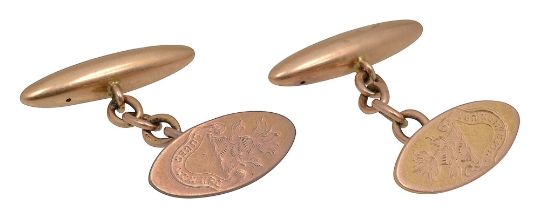 A pair of 15ct gold cufflinks hallmarked 1902, with engraved oval panels with crest, link chain and torpedo backstotal weight approx. 7.3g