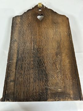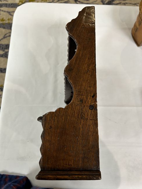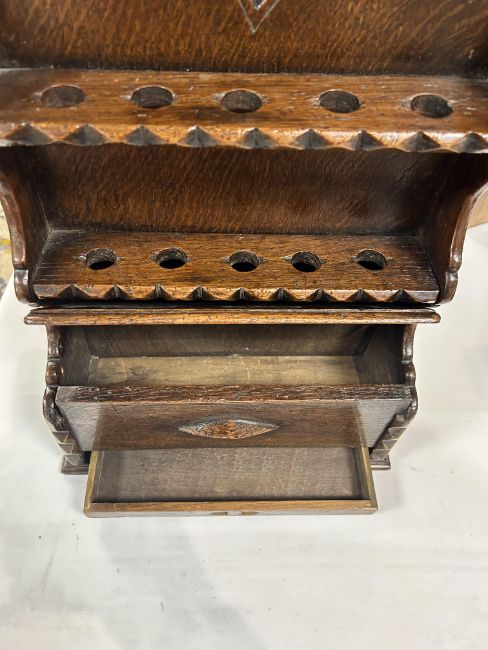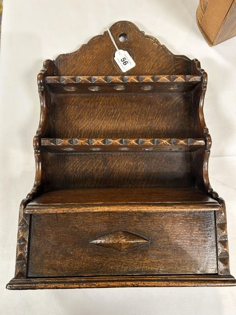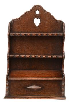 A Victorian style oak spoon rackthe top with a pierced heart above two shelves, the base with a hinged box probably for candles and a concealed narrow lower drawer