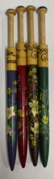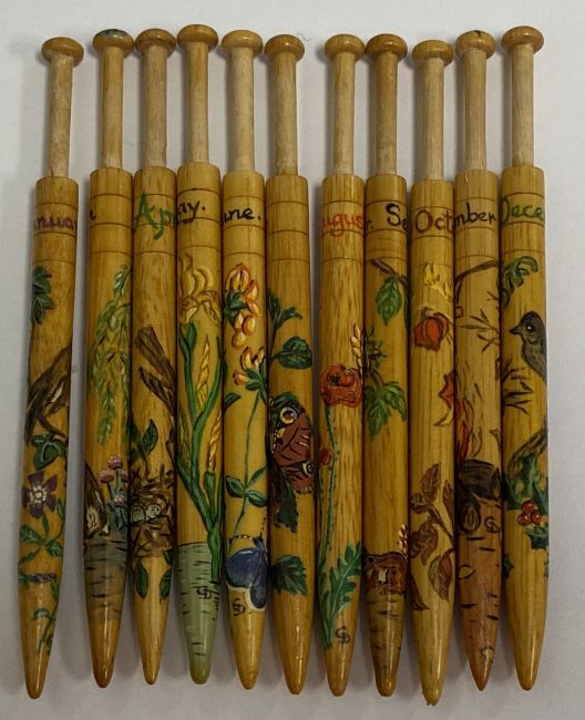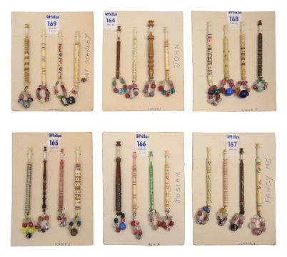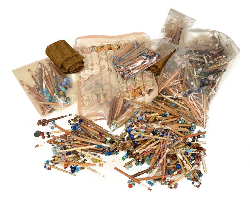 A large collection of lace bobbins an assortment of wood and bone bobbins variously decorated with beaded spangles, a group of labelled lace bobbins with their original packaging; 'John', 'Josiah', 'Fancy Me' and 'Ann Stanley', including a set of hand painted with seasonal colours and months of the year lace bobbins by Gill Davies (qty)