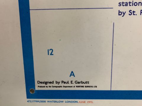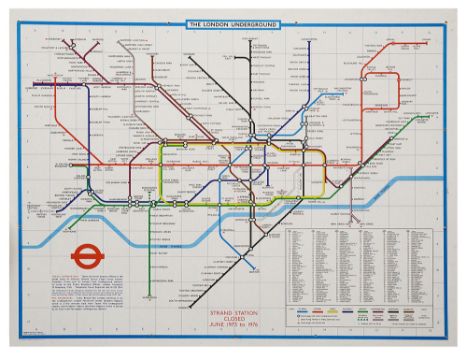 A London Underground station wall display map, laminated plywood in Quad Royal format,dated June 1973, by Waterlow London, designed by Paul E. Garbutt, Produced by the Cartographic Department of Hunting Surveys Ltd., with drilled holes for wall display, the map detailing Piccadilly Line extension Heathrow line under construction, Strand station closed and dated June 1973 - 1976, approximately 101cm x 127cm