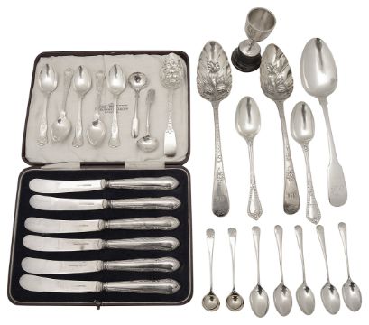 A pair of George III berried Old English pattern tablespoons and other later silverfirst London, 1801 by William Eley and William Fearn, initialled, together with two Victorian Grecian pattern teaspoons, London, 1872 by George Adams, a George IV fiddle pattern tablespoon, five Kings pattern coffee spoons, two pairs of salt spoons, a small trophy cup on ebonised plinth base and a cased set of six electroplated Reed and ribbon pattern tea knives, (qty)