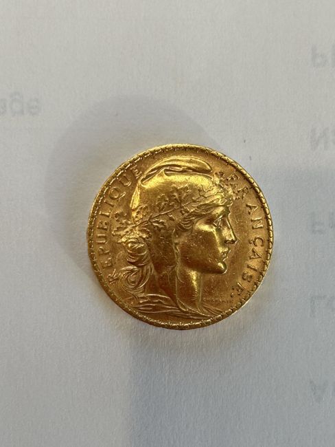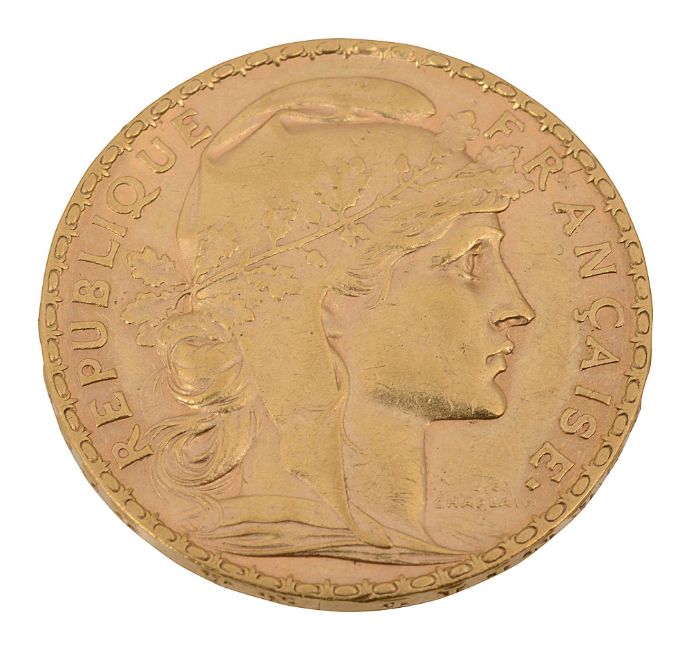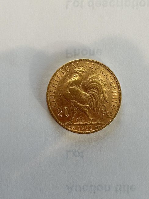 A French 20 franc gold coinhead facing to the right and dated 1908diam. 21mm, weight approx. 6.6g