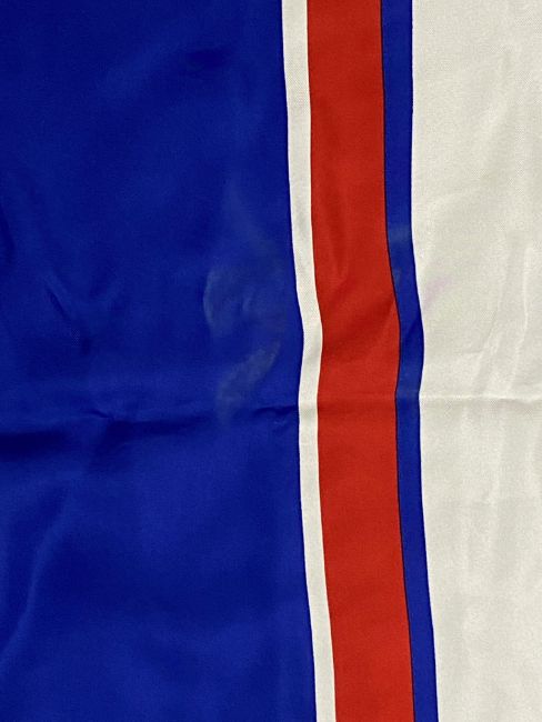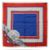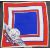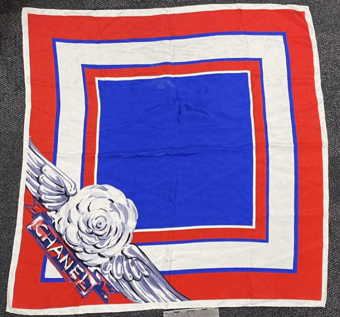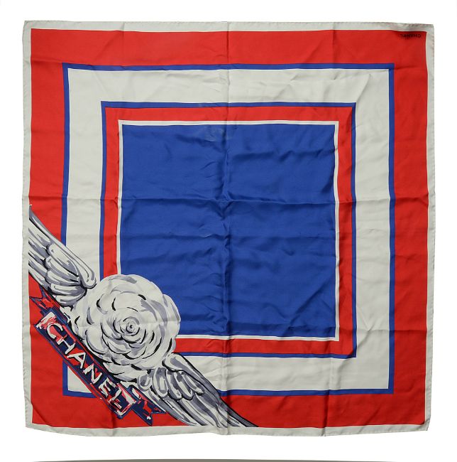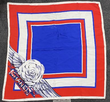 A Chanel silk scarf on a red, white and blue groundwith Chanel logo and winged camellia, Made in Italy.approx. width 85.5cm