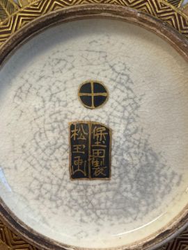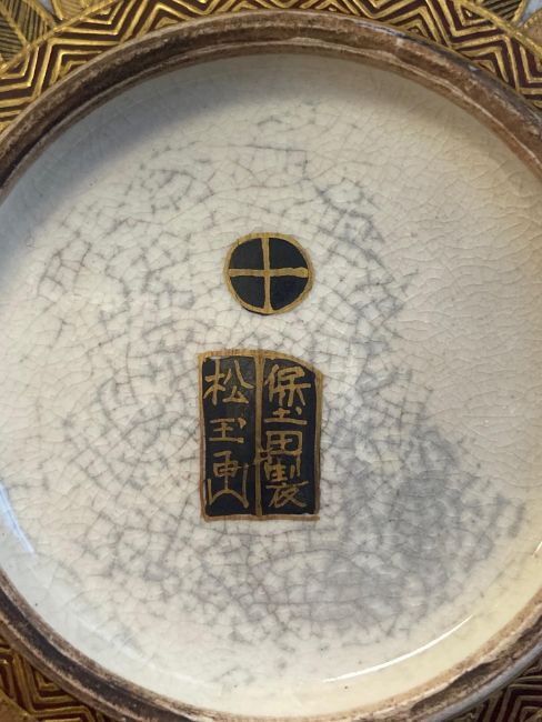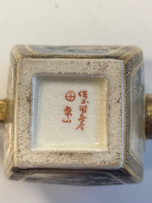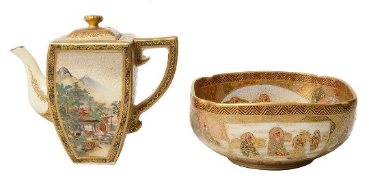 A Japanese Meiji period Sastusma Kinkozan type teapot and and a bowlfirst of square tapering form, the sides finely painted with panels depicting a mountainous village landscape, flowers, and ducks by a stream with overhanging wisteria, geometric and chrysanthemum head borders, red painted character marks, the bowl of square lobed form, decorated with panels of figures, signed, (2)First