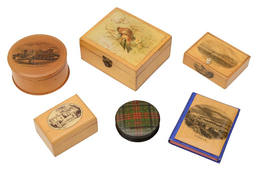 A Mauchline ware group of six itemsto include a circular lidded box showing the East Terrace Windsor Castle, a small box showing Dover on the Sea, a small book with an image of Dunkeld, 'Rills from the River of Life', a circular tartan ware box, and two other small boxes, (6)circular box diam.5.5cm, largest, width 9.5cm