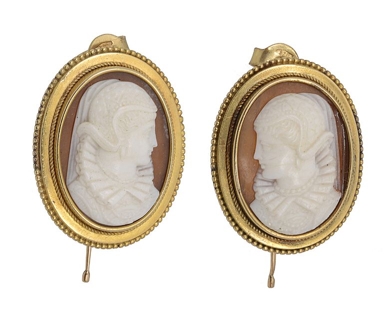 A pair of shell cameo earringseach oval cameo depicting the head and shoulders of a lady in Elizabethan dress, collet-set to the border applied with rope twist and spherical bead decoration, hook fittings (adapted) Approx.