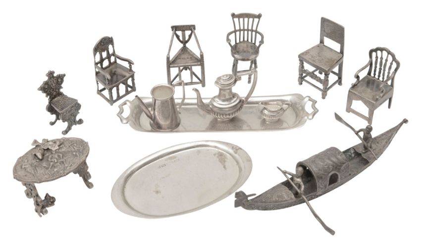 A collection of modern novelty silver miniature armchairs and other noveltiesmost Birmingham, 1979 by S J Rosecomprising five armchairs in various styles, a rococo style cast dining table with two fish on top and a Kitten on one leg and a matching chair, a German .800 miniature Venetian gondola with foliate scroll embossed decoration and two tea trays, a coffee pot and matching milk jug etc., (qty)various., weight approx. 9.88ozt.
