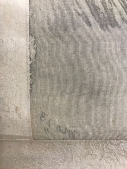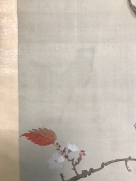 Two Japanese painted wall hangingscirca 1900each on rollers with ebony turned ends, the first of a branch with a woodpecker and leaves, prunus and chrysthaneum blooms, the other with a bird on a branch by a river with pink, white and red flowerheads, the lower left corner with indistinct numbers and letters (2)
