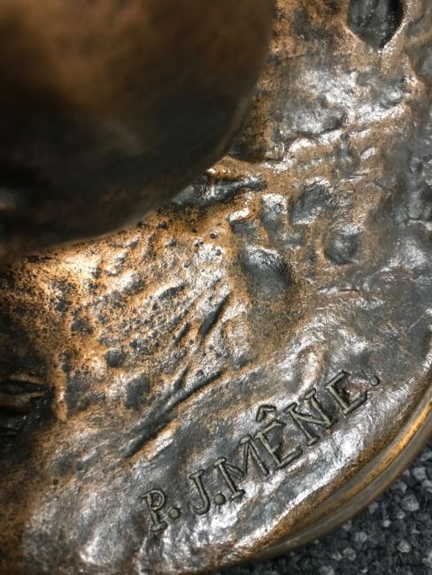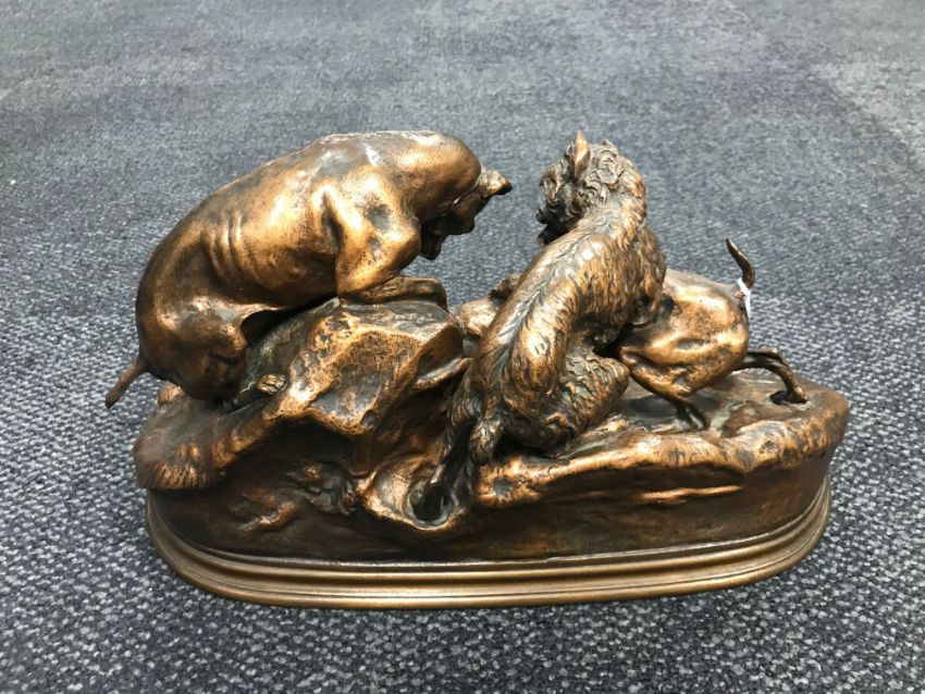 After Pierre Jules Mene (1810-1895) 'Chasse au lapin'a bronze group of dogs after a rabbit on a rocky naturalistic base, signed lower left, 'P.J. Mene', raised on an oval verde anticio plinth, (2)without marble base