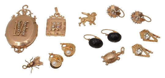 Continental gold jewellery to include a locket and pairs of ear pendants most bearing French 18ct gold control markscomprising an oval hinged locket bearing half pearl set initial, a half pearl set pendant, half pearl set cluster drop ear pendant, a pair of carved garnet ear pendants and two other pairs set with cultured pearls and white stone, together with three charms in the form of a fly, a poodle and a tortoise, (qty)First