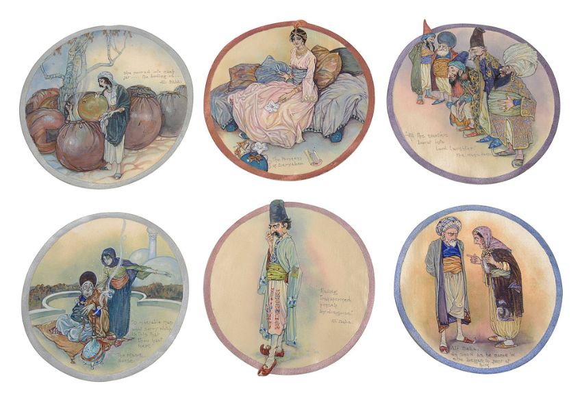 After Edmund Dulac (1882-1953)a group of scenes taken from Laurence Housman's retelling of 'The Arabian Nights' illustrated by Edmund Dulac, including a scene from 'The Story of the Princess', three scenes from 'Ali Baba and the Forty Thieves' and two scenes from 'The Magic Horse', gouache on silk roundel (6)Diameter 13.5cm