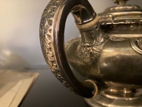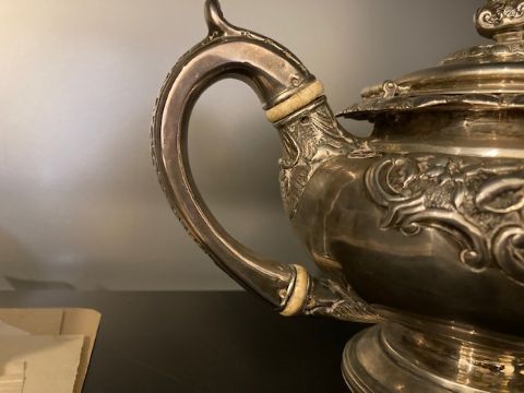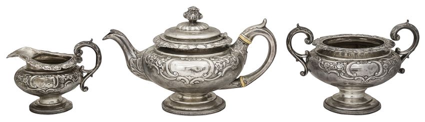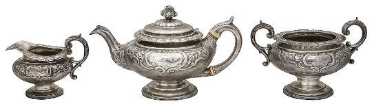 A Scottish George IV silver three piece pedestal tea service Edinburgh, 1826 by James McKaycomprising teapot, twin handled sugar basin and cream jug, of compressed circular tapering form, embossed with a band of flowers and c scrolls with vacant reserves, trailing ivy embossed rim and leaf scroll handled, on a circular domed pedestal foot with beaded rim, the teapot with hinged domed lid with bud finial and ivory insulators, (3)Teapot handle to spout 28.5cm.,weight approx. 47.9ozt.