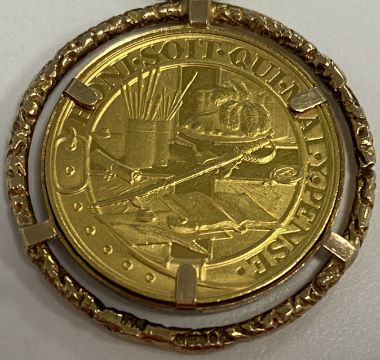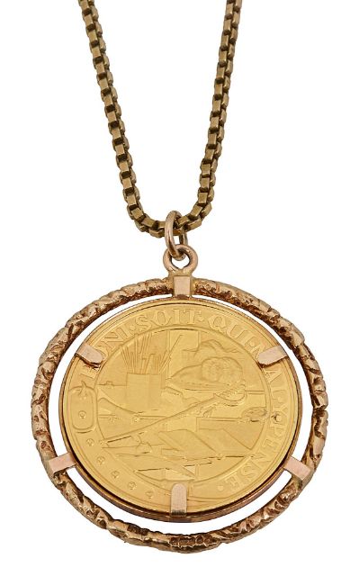 A 1974 Churchill centenary of Birth 1874 prooflike gold medallion on a square link articulated long chain, in a loose mount with a safety chainCoin weight approx. 7.65g,
