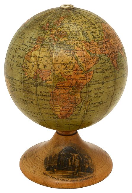 A Mauchline ware terrestrial desk globethe base printed with 'Ruins of BlackFriars Chapel St Andrews