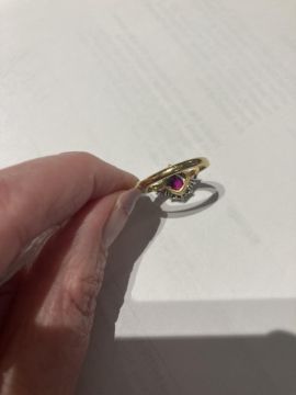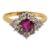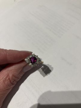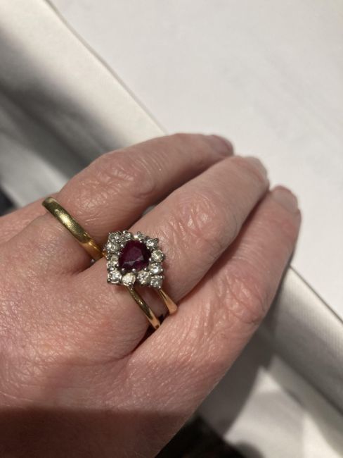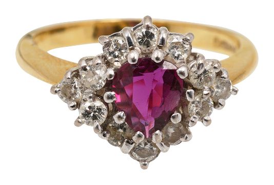 A ruby and diamond-set ringthe central pear-shaped ruby within a surround of brilliant-cut diamonds to the 18ct yellow gold plain tapering shank, London hallmarkring size P, 4.9g