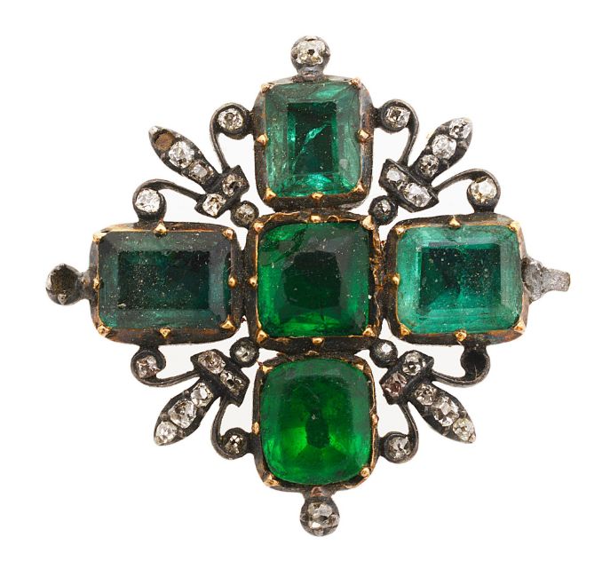A mid/late 18th century green stone and diamond-set brooch with three foiled emeralds and two later paste stones set within cut-down collets with diamond collet terminals, separated by an old-cut diamond-set fleur de lys, closed back silver and yellow gold setting, later brooch fitting