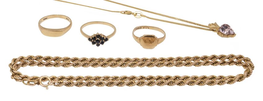 A 9ct gold and sapphire ringstamped and signed 'P&RB', including a 9ct gold ring stamped and marked '86', a 9ct gold signet ring stamped and signed 'BS', a 9ct gold flattened curb link chain with pale pink paste pendant with a continental rope chain marked '9KT' (5)Total weight 11.9g
