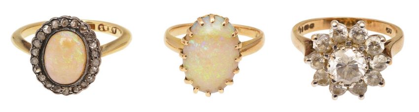 Three rings an oval opal cabochon and old-cut diamond cluster ring, to the 15ct yellow gold plain tapering shank; an oval opal ring to the plain tapering shank stamped '18ct', and a colourless stone cluster ring to the hallmarked 9ct yellow gold setting, (3)the former ring size L1/2,3.6g, ring size I, 3.0g, ring size L, 3.8g,