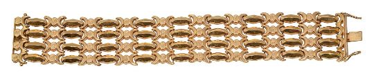 An 18ct gold cuff braceletwith bands of four deep lozenge form links, marked to clasp
