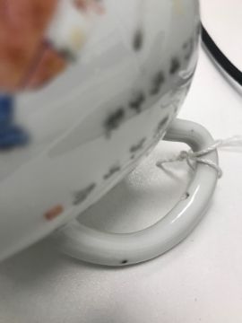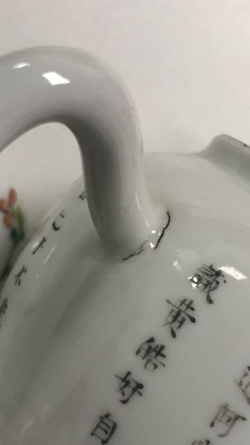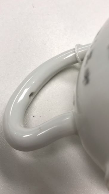 Condition: There are two very small hairline cracks where the upper handle meets the body of the teapot. The gilt decoration to the tip of the spout is worn. There is a small hole to the inside of the handle. There is a small spot in the glaze to the underside of the handle. Inside the pot and behind the hairline, there is a tiny amount of light visible, possible old repair to this area. See image.