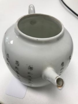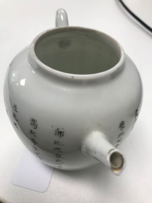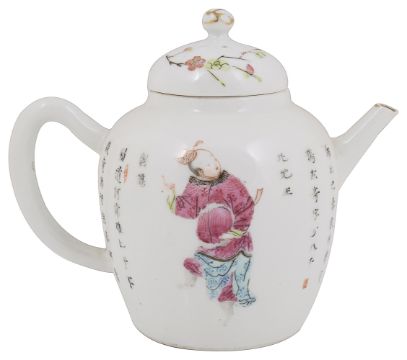 A Chinese famille rose teapot and cover, late 19th / early 20th century, decorated extensively with calligraphy inscriptions and two figures
